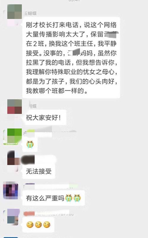 此外,蔣玉芬還表示,學(xué)校領(lǐng)導(dǎo)稱,事情鬧那么大,她再在這個班也不妥,給當(dāng)事學(xué)生轉(zhuǎn)班更不好,其他老師也不敢收,所以調(diào)換她的工作最妥善。“校長打來電話,說保留該學(xué)生在三年二班,換我這個班主任,我平靜接受。沒事的,雖然家長拉黑了我的電話,但我理解你特殊職業(yè)的憂女之母心,都是為了孩子,我教哪個班都一樣的。”