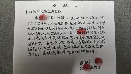 警方轉發給記者的秦總的道歉信。仁懷市公安局供圖當晚,仁懷市公安局刑偵大隊的民警通過微信給記者發來一封秦總的道歉信,稱不該對記者進行威脅,現在也很后悔。記者隨后委托辦案民警轉告秦總,接受道歉,并勸他以后好好做生意,別搞非法的事了。