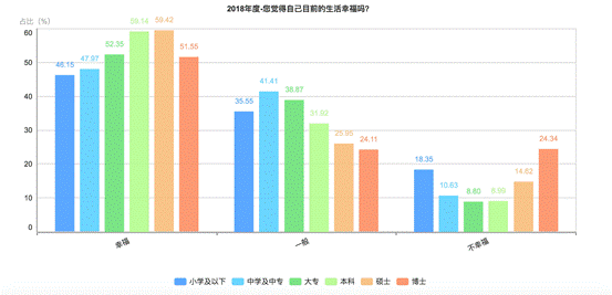 知識越多越幸福嗎?答案是否定的。大調(diào)查發(fā)現(xiàn),從學(xué)歷來看,碩士(59.42%)和本科學(xué)歷受訪者(59.14%)感覺幸福的比例最高。值得注意的是,博士學(xué)歷受訪者(51.55%)感覺幸福的比例不僅低于碩士本科,甚至還低于大專學(xué)歷(52.35%),在感覺不幸福的人群中,博士學(xué)歷受訪者占比是最高的(24.34%),超高學(xué)歷群體的這個(gè)現(xiàn)象值得引起重視。