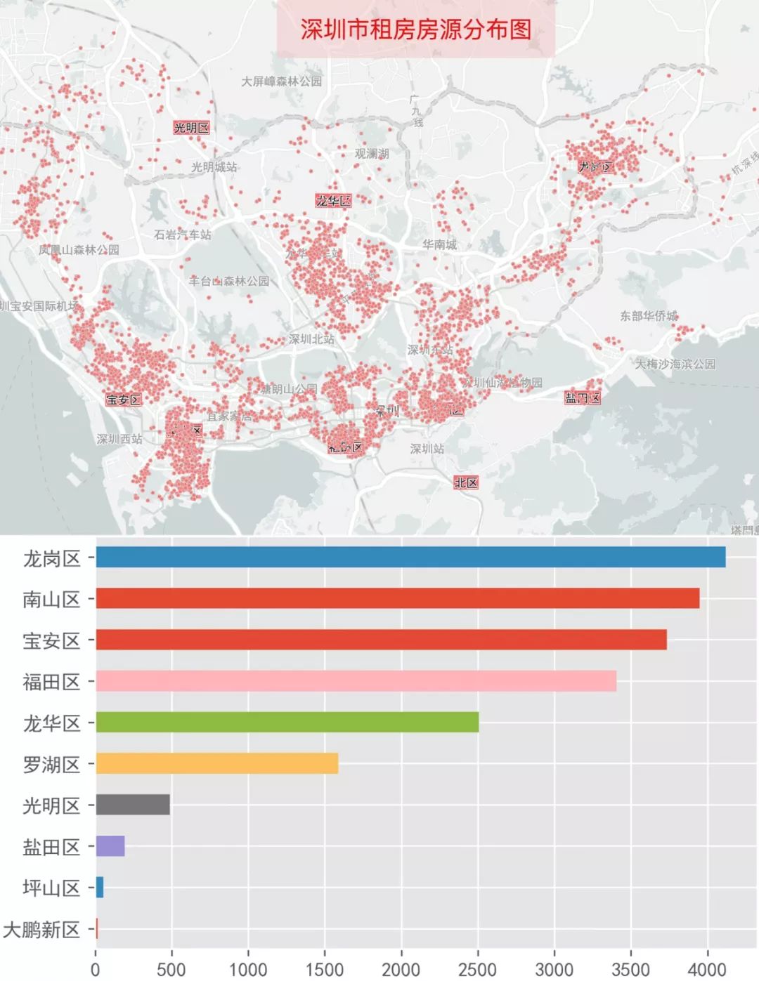 深圳的房源共有20054條,更集中在各區(qū),除了四個新區(qū)零星分布的房源外,主要還是分布在寶安、南山(科技園)、福田、羅湖、龍崗區(qū)中心,以及坂田、布吉、3號線沿線,11號線沿線(是市中心的租金太貴了吧?)