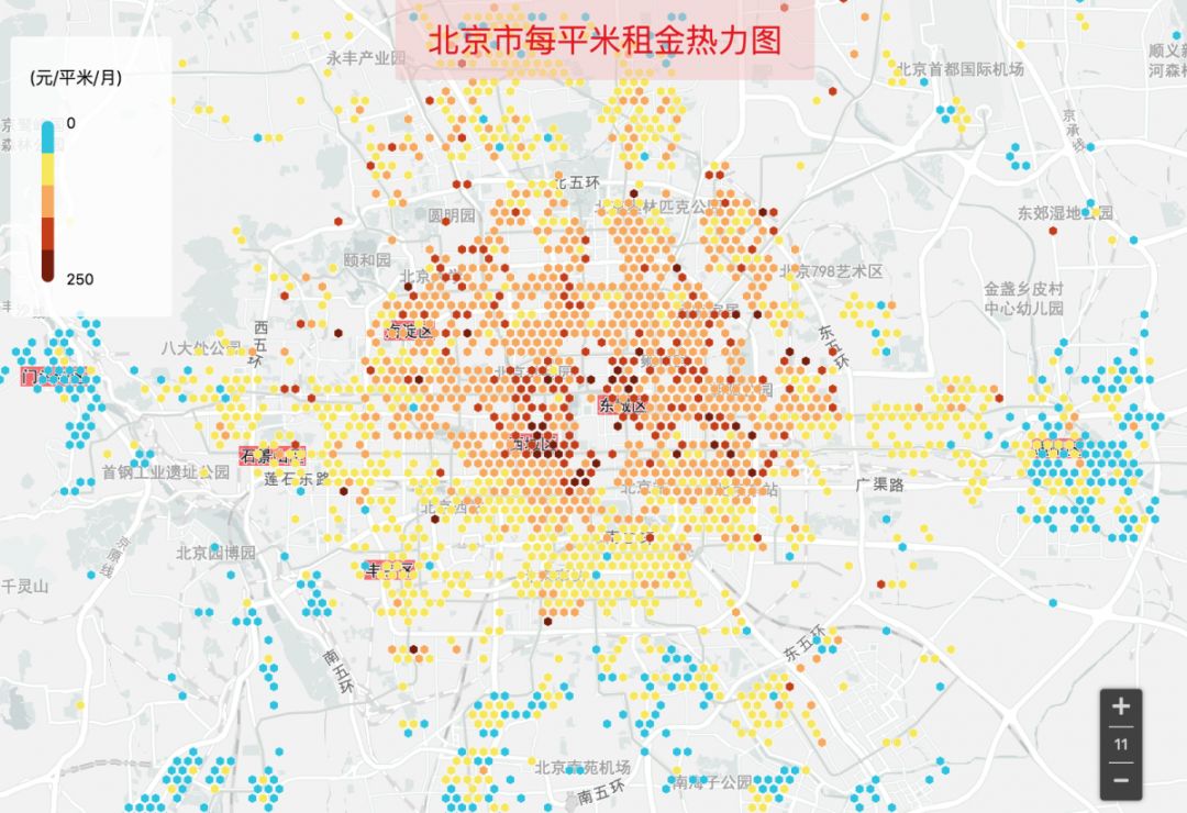 租房房源分布透露出來的信息其實不多,我們更關(guān)心的是各區(qū)域的價格。為此我們計算了各房源每平米每月的租金,并繪制了熱力地圖,先來看北京的。