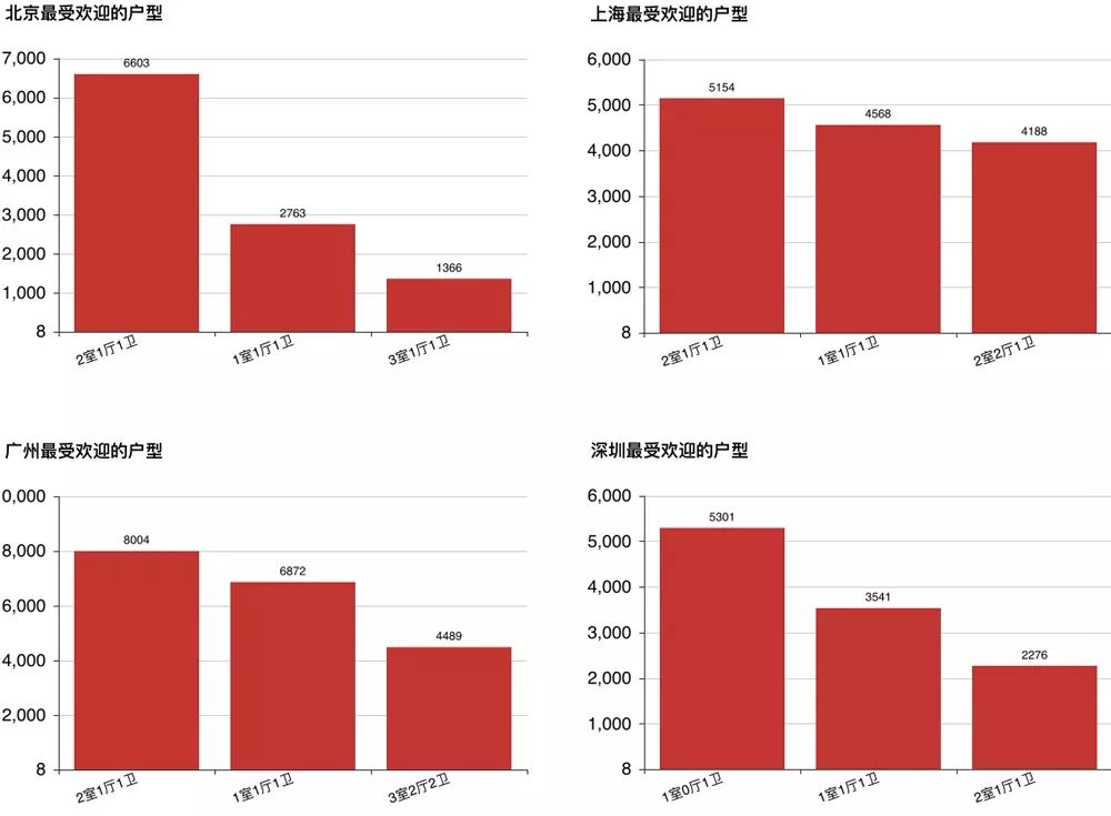我們統(tǒng)計了北上廣深各城市房源最多的3種戶型。