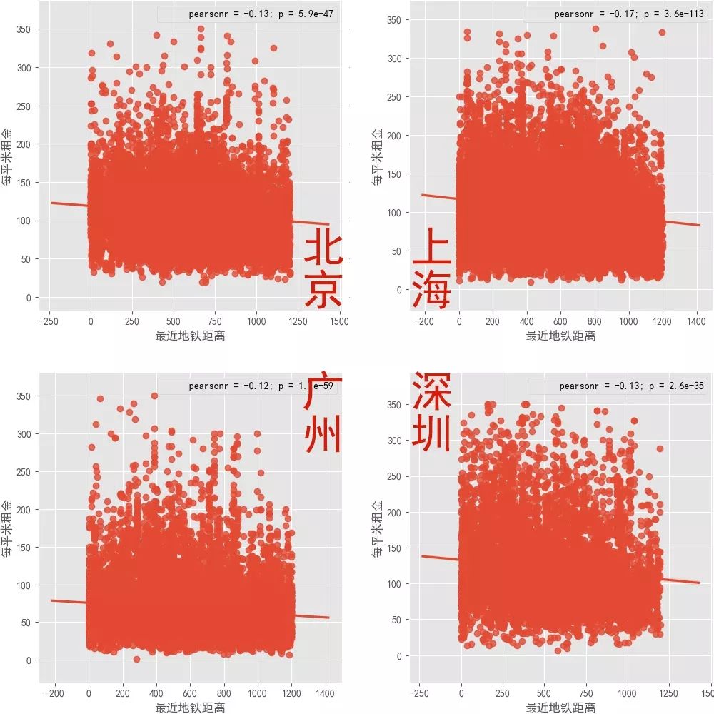 租房,其中一個終點考慮的因素就是距離地鐵的遠近。我們把個城市房源距離最近地鐵站的距離跟每平米租金進行了回歸分析,并且計算了相關(guān)系數(shù)。