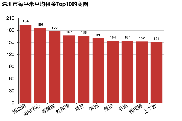 再看前10的商圈,果然深圳灣以每平米租金194元領(lǐng)先,然后是福田中心和香蜜湖。
