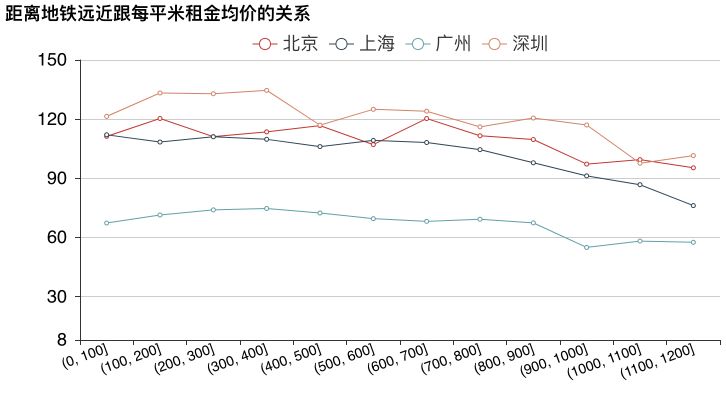 可見,北京市只要地鐵在900以內(nèi),每平米租金變化不大。900米和1000米租金差距為12.5元,也就是說,租一個20平的房子,距離地鐵站900米和1000米的租金差距是250元。