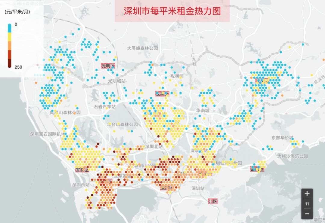深圳每平米租金大于100元的房源主要集中在南山區(qū)(深大、深圳灣、科技園)、福田區(qū)(特別是梅林和香蜜湖)、以及羅湖區(qū)。寶安、龍華、布吉主要以每平米租金50-100元為主,11號線碧頭端以及龍崗區(qū)主要以每平米租金50元以內(nèi)為主(是不是有很多小伙伴愿意租在這里,搭地鐵去市區(qū)上班的?)。