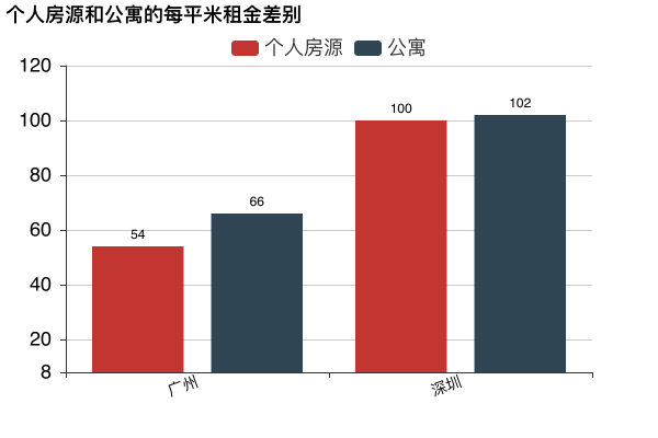 ?。ㄗⅲ河捎阪溂揖W(wǎng)上對北京、上海的公寓標注很少,只占總房源數(shù)量的2%和4%,所以只展示廣州和深圳的數(shù)據(jù))