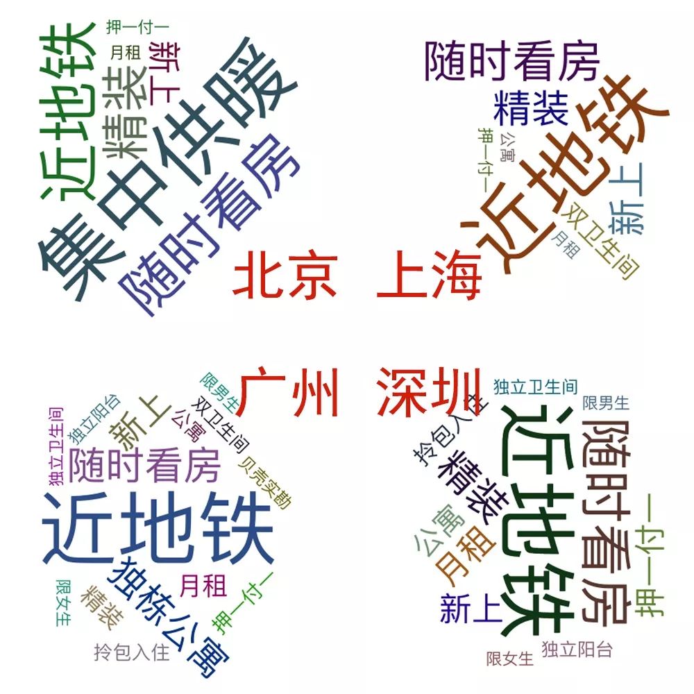 最后,我們對每個房源的標簽進行了統(tǒng)計,并且繪制了詞云圖,可以看出各城市租房時思考的側(cè)重點。