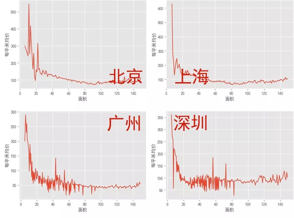 我們把各城市房源的面積和每平米均價繪制出關(guān)系圖??梢钥吹?,不管是哪個城市,出租面積在15平米以內(nèi)的房子每平米租金都是最貴的,當(dāng)然這里不排除租金貴的區(qū)域有更多單獨出租的小房間這個原因。但是還是可以看出來,如果有認識的好友一起租大房子,不僅每平米的租金更便宜,而且還可以有一個大點的公用客廳。