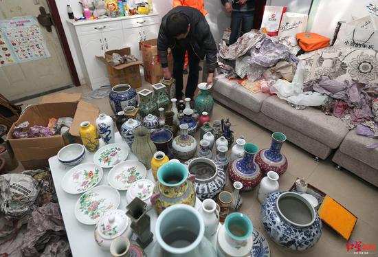 李大姐還在喃喃罵著,“你個(gè)死人!你個(gè)死人!”記者在現(xiàn)場數(shù)了一下,放在客廳的瓷瓶、瓷碗共有66件。不斷安撫之后,吳超才開始介紹,“這個(gè)元青花梅瓶,差不多3萬。”隨后,他又拿起一個(gè)清代的瓷缸,“這個(gè)要一萬多”。