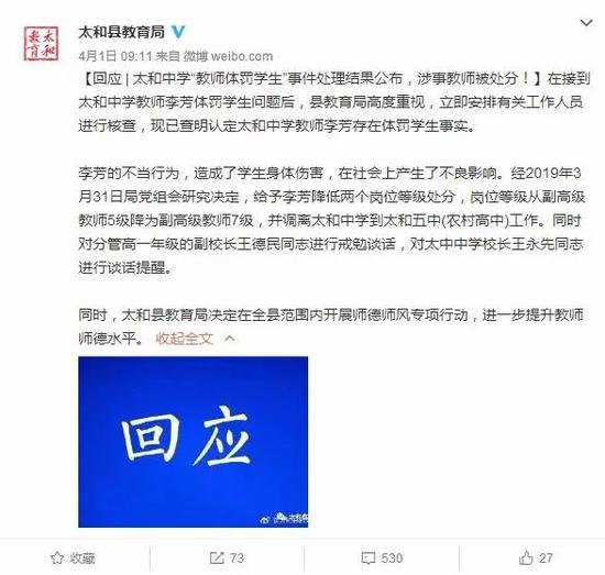 對此,4月1日,太和縣教育局官微回應稱,已查明認定太和中學教師李芳存在體罰學生事實。經局黨組會研究決定,給予李芳降低兩個崗位等級處分,崗位等級從副高級教師5級降為副高級教師7級,并調離太和中學到太和五中(農村高中)工作。通報中特意給“農村高中”加了括號,發出后引起諸多爭議。許多網友表示驚詫和憤怒,“農村高中為什么要接收打人的老師”“農村學生招誰惹誰了”。