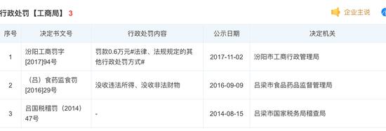 而根據公示信息顯示,杏汾酒業曾因廣告不規范等原因,被相關部門處以行政處罰。因涉嫌經營標簽配料表不規范的汾杏竹酒,2016年9月被原呂梁市食藥監局沒收違法所得、沒收非法財物。因酒類廣告中出現鼓動、倡導、引誘人們飲酒或者宣傳無節制飲酒內容,2017年11月,被原汾陽市工商行政管理局罰款0.6萬元。