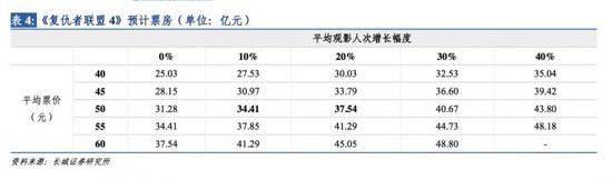 另據長城證券研報預估,《復聯4》票房預測在 25 億至 48 億之間。“當觀影人次增長幅度分別為 0%、10%、20%、30%、40%,平均票價分 別為 40、45、50、55、60 元時,可得到一系列《復仇者聯盟 4》預計票房。因為票價與觀影人次成反比關系,我們剔除最高票價與最高觀影人次得到的最樂觀情況組合,得到預測票房區間。 考慮中性假設情形,即在《復仇者聯盟 3》平均觀影人次為 6257 萬的條件下且觀影人次 增長幅度為 10-20%,全國平均票價為 50 元時,《復仇者聯盟 4》的預計票房為 35 億左右。 ”