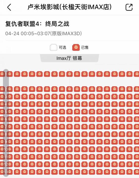 (爆滿IMAX廳與冷淡六號廳)同時,21世紀經濟報道記者以燈塔研究院影院吸引力指數排名前20位的影院作為樣本,在淘票票APP上搜索《復聯4》上座率,結果各異。在零點場中,北京耀萊成龍國際影城(五棵松店),在23:59-0:15,13個廳放映《復聯4》,一個VIP廳滿座,上座率均很高;北京首都電影院(西單店),0:00-0:20場次,3個廳,一個廳滿座,上座率均很高;北京金泉港IMAX國際影城,0:05-0:10,19個廳,五個廳滿座,其中三個VIP廳,上座率均很高;北京金逸國際影城(朝陽大悅城店),0:00-0:25,8個廳,三個廳滿座,其中兩個VIP廳,上座率均很高;北京寰映影城(合生匯店),0:10-0:20,五個廳,上座率均很高;上海中影國際影城(合生匯店),0:15-0:30,三個廳,上座率中等,約二分之一,約35人;上海萬達影城(五角場店),0:10-0:30,6個廳,上座率均較高。