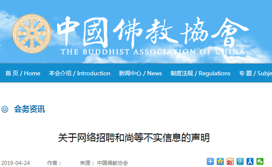中國佛教協會24日在其官方網站發布聲明,對當前微信、微博等互聯網一些自媒體上出現的某些寺院招聘和尚尼姑等信息進行辟謠。