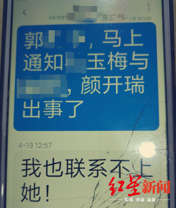但黎玉梅依然沒有消息,親屬們懷疑她被郭銘南轉移到了廣州。紅星新聞記者撥打了郭銘南歸屬地為廣州的手機號,結果為呼叫轉移,無人接聽。黎鵬也曾多次撥打郭銘南的電話,均未能接通,又發短信告訴他顏開瑞出事了,要他馬上通知黎玉梅及其女兒,他回復了黎鵬一條:我也聯系不上她!