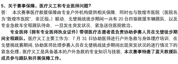 戈壁環境特殊,父母起初不同意,她把資料文件都拿給他們看——參賽學生曾收到一份《組委會應部分參賽者問題統一回復》,顯示醫療保障齊全,救援車、專業醫生、藍天救援隊成員都在跟隊保障之列。