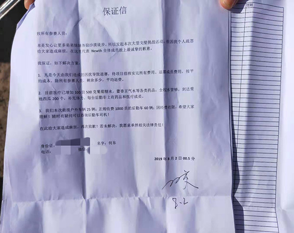 他更在意的是開完會后要求簽訂的參賽聲明,上面寫著,比賽期間如果出現人身或財產損害,將獨立向保險公司索賠。這份文件沒有第三方公證,沒有公章,他感到奇怪:這不是霸王條款嗎?他在參賽者的群里問了問,有同學回:“說是不簽就不能參加活動,并且不退還費用。”