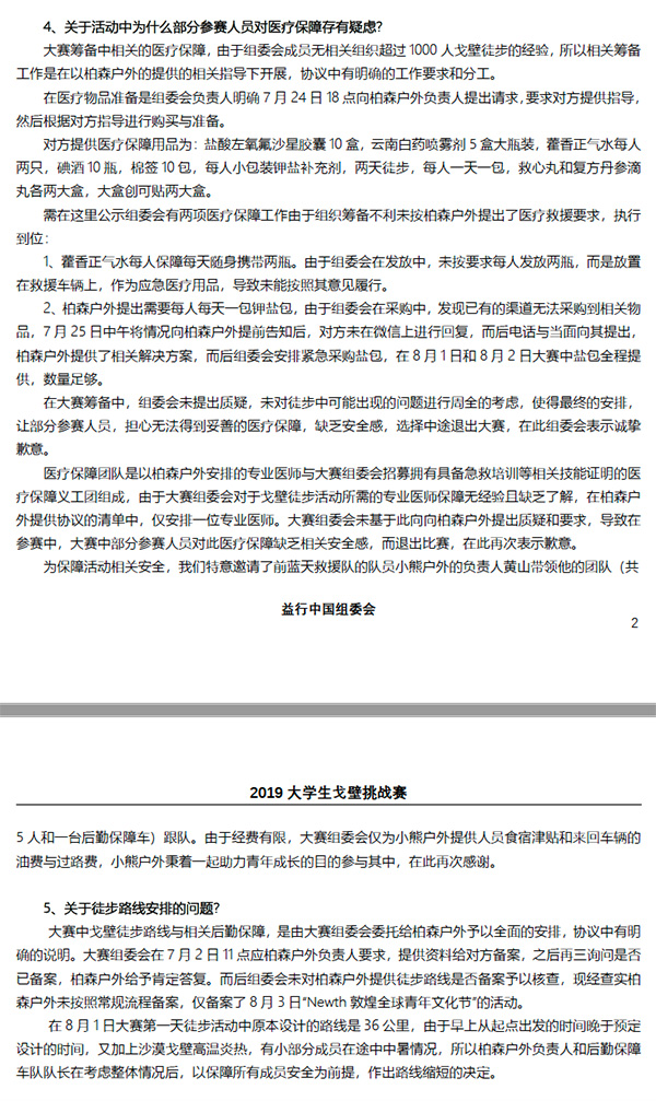 組委會于8月10日發布的《益行中國2019 大學生戈壁挑戰賽徒步活動賽事公開信》