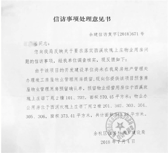 余杭區住建局還表示,開發商并未在該局辦理過竣工房屋物業管理用房提留。