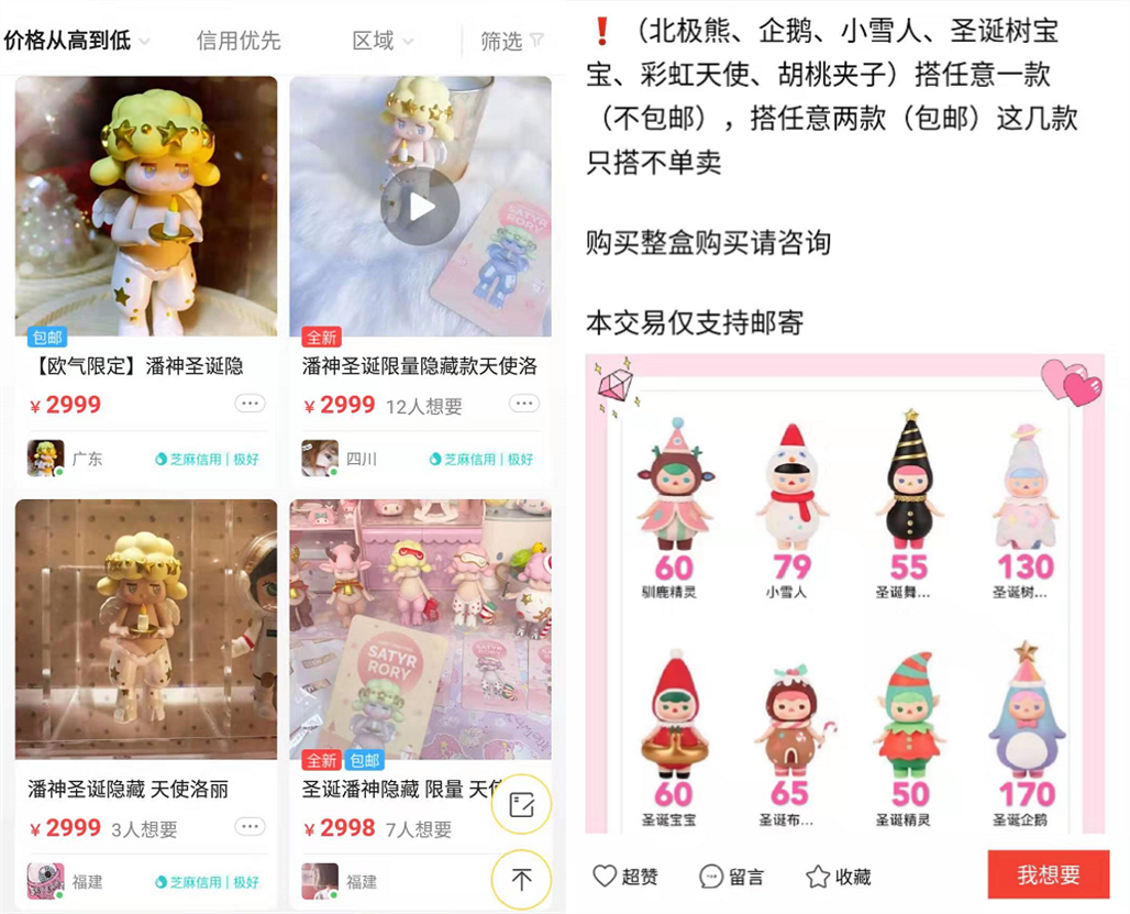 閑魚的統計數據顯示,漲價最迅猛的“潘神”隱藏款盲盒原價59元,閑魚價2350元,狂漲39倍;而“Molly”隱藏款原價59元,閑魚均價1350元,漲幅達22倍。中新經緯客戶端發現,目前閑魚平臺已出現標價為2999元的盲盒,且大多備注“不議價”,漲幅達到了50倍。