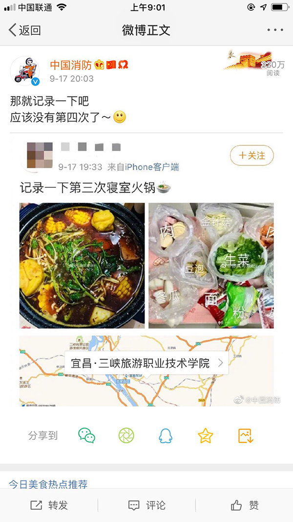 @中國(guó)消防 發(fā)現(xiàn)學(xué)生在寢室吃火鍋(微博截圖) “記錄一下第三次寢室火鍋”,9月17日19時(shí)33分,一名網(wǎng)友發(fā)微博“炫耀”在寢室吃火鍋,并附上兩張圖片,還“嘚瑟”地標(biāo)注了吃火鍋的地點(diǎn):三峽旅游職業(yè)技術(shù)學(xué)院。