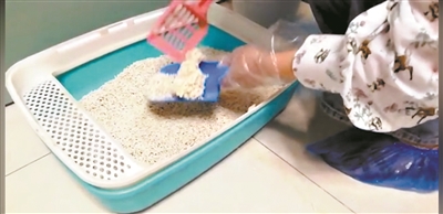 寵托師在給貓咪處理糞便。