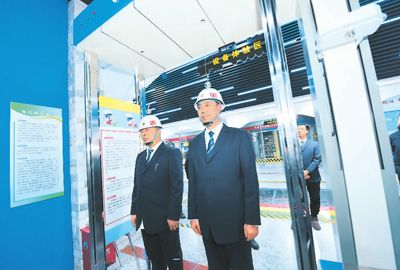 2019年1月,中鐵哈爾濱局牡丹江機務段“勞動人身安全體驗室”在黑龍江省牡丹江市建成并投入使用。圖為參觀人員在體驗高空墜物帶來的危害。張春祥攝(新華社發)