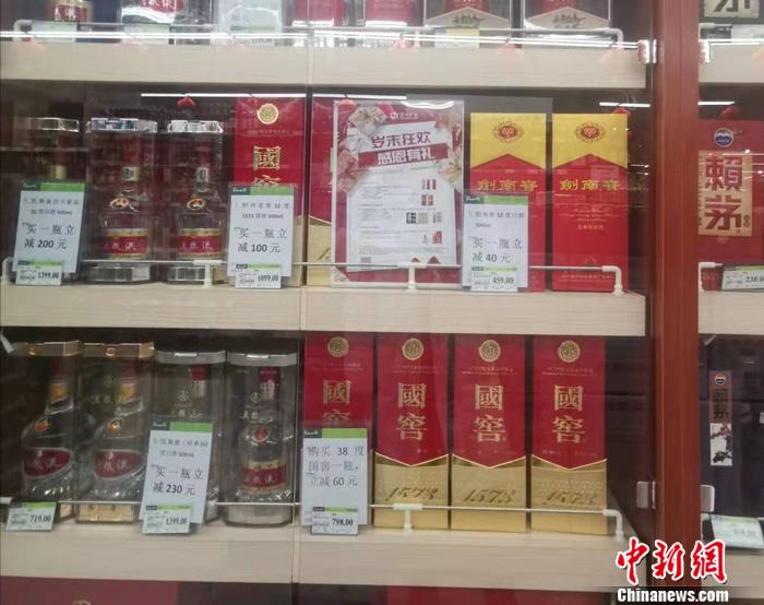 如,在北京豐臺區一家永輝超市,瀘州老窖推出“歲末狂歡 感恩有禮”活動,目前500ml的52度國窖1573售價是1099元一瓶,與此前宣布的建議零售價保持一致,但購買立減100元;劍南春52度白酒售價459元,買一瓶立減40元。