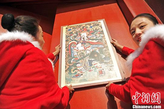 資料圖:遼寧沈陽,工作人員于“小年”當天在沈陽故宮內懸掛門神。 孫昊聲 攝