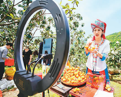 近日,廣西龍勝各族自治縣的枇杷進入收獲期,人們忙著采摘枇杷出售,銷往各地。圖為4月26日,在龍勝各族自治縣泗水鄉龍甸村枇杷種植基地,工作人員通過網絡直播銷售枇杷。