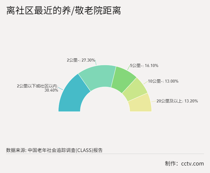 當子女無法滿足老人的需要時,他們會考慮住到養老院。超過半數的養老機構和老人住所的距離不超過2公里,但也有13.2%的老年人需要走20公里才能找到一家養老院或敬老院。