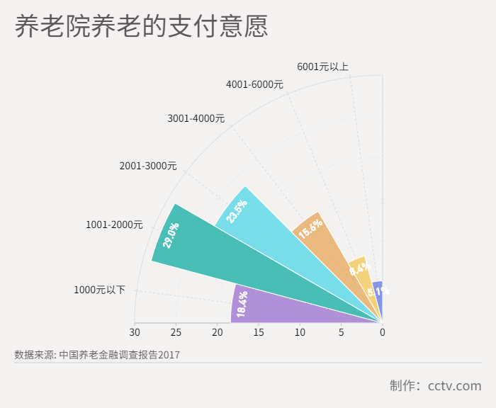 對于在機構養老的花費,近半數老年人的接受程度在每月2000元以下。能夠每月花費超6000元的5.1%,是老年人中的高端消費人群。