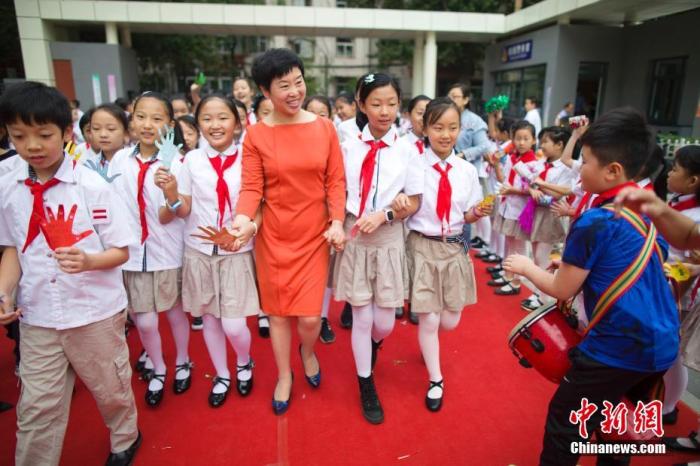 資料圖:老師們牽著學(xué)生的手走過紅地毯步入校園,并接受學(xué)生們的敬禮與祝福。 張?jiān)?攝