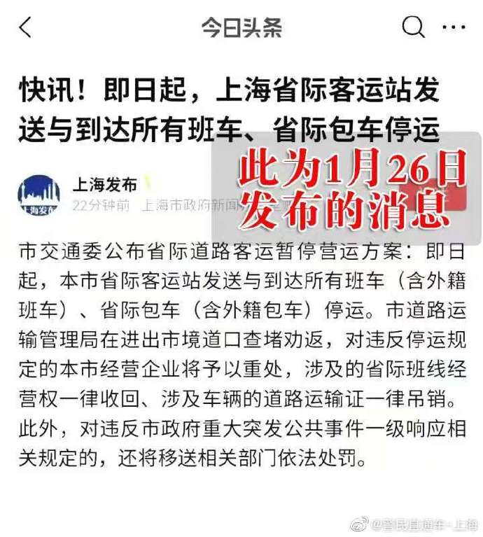 而趙某所發布的上海省際道路客運暫停營運,實為今年1月26日的通知。