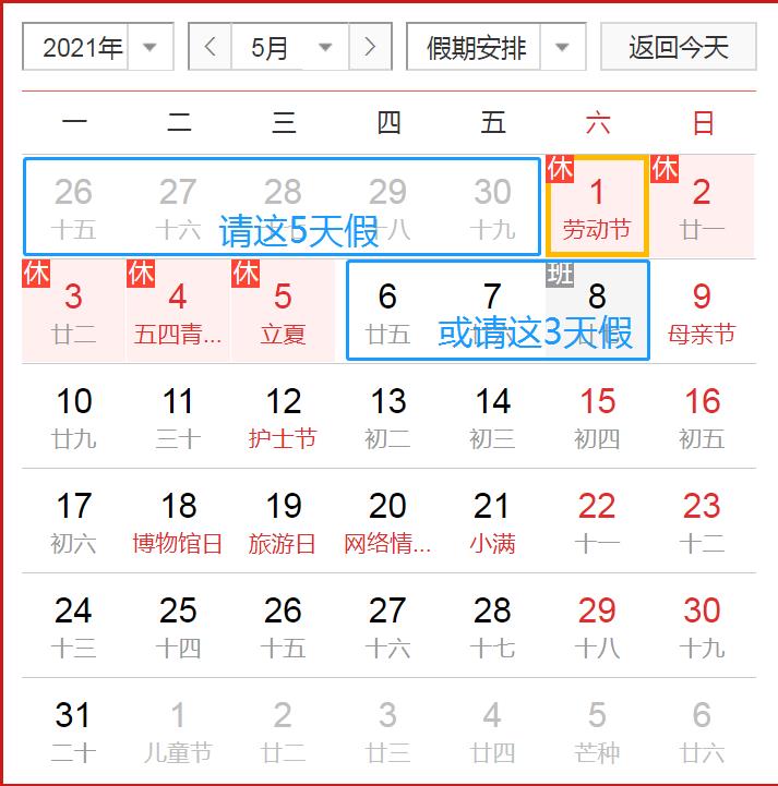 勞動節假期也有兩種拼法,一種是5月6日至8日請3天假,獲得9天假期;另一種是4月26日至30日請5天假,獲得12天假期。