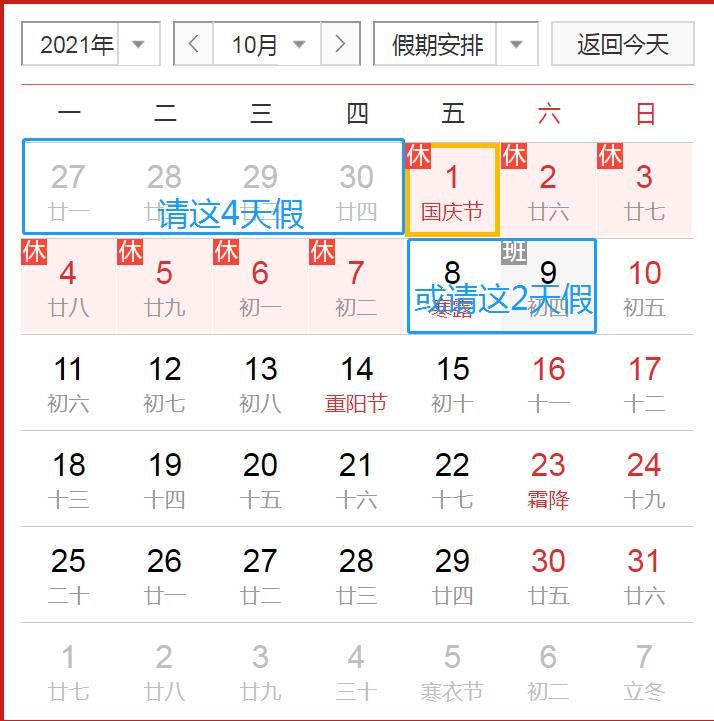 沒法連續多天請假的朋友們也不要灰心,“十一”假期十分給力。在原本7天的假期基礎上,只需在10月8日和9日請兩天假,即可拼成10天假期。