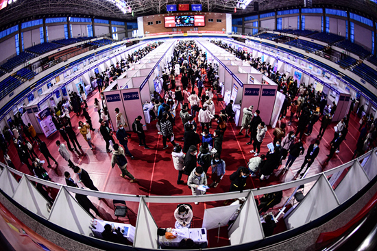 11月19日,遼寧沈陽,東北大學2021秋季就業雙向選擇洽談會上人頭攢動。 當日,東北大學2021秋季就業雙向選擇洽談會在該校劉長春體育館舉行,500余家企業提供了5000多個就業崗位。視覺中國供圖