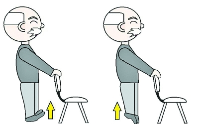 挺直站立,手扶椅背,前后晃動(dòng)身體,腳尖與腳跟循環(huán)著地以鍛煉下肢肌肉,達(dá)到控制重心的目的。身體晃動(dòng)幅度不要過(guò)大,腳尖/腳跟與地面呈30度角度。