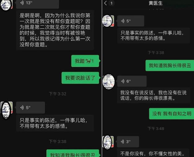 小魚在網帖中稱,2021年5月7日,她發了一條朋友圈,該男醫生又找其聊天,并在聊天中對其性騷擾。網帖出示的微信聊天截圖顯示,備注為“黃醫生”的用戶在語音中說,“你的胸長得很漂亮”“反正我也看過你啊,就當扯平了”。此外,“黃醫生”還發了疑似他自己下體的不雅照片。