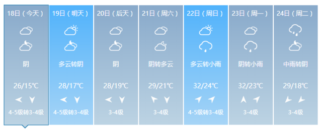 21日白天到夜里,多云轉(zhuǎn)陰,南風(fēng)2級(jí),氣溫27~19℃。