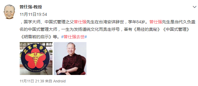 11日晚,國學大師、“中國式管理之父”曾仕強先生在臺灣安詳辭世,享年84歲。