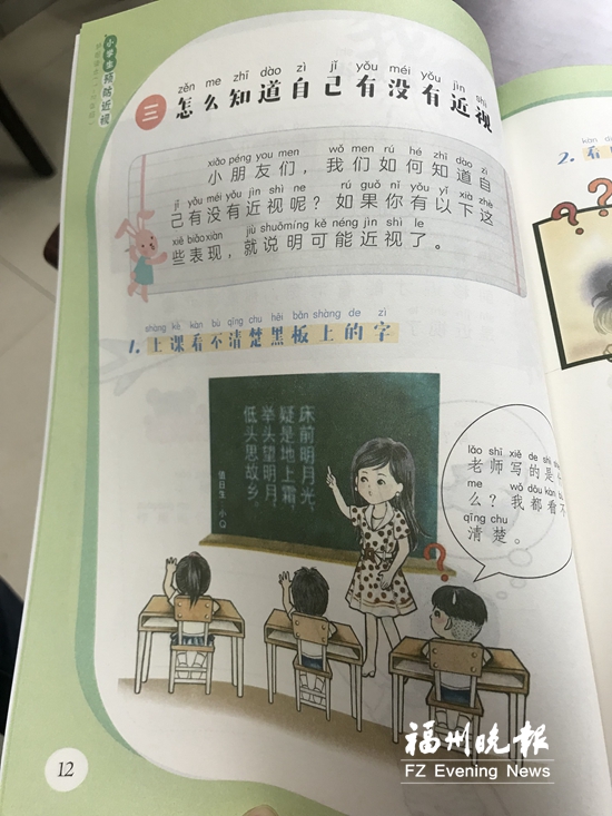 記者看到,小學(xué)一、二年級的讀本根據(jù)低年級孩子的特點(diǎn),不僅用了拼音,而且語言風(fēng)格通俗俏皮,圖文并茂。小學(xué)五、六年級的讀本,關(guān)于近視的原理等知識有了更多拓展,但都在小學(xué)生能理解接受的范圍內(nèi)。