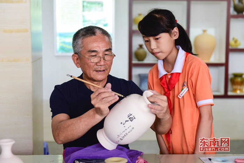 在磁灶陶瓷燒制技藝傳承基地,一名老師正在向學生教學。東南網記者 林婕 攝