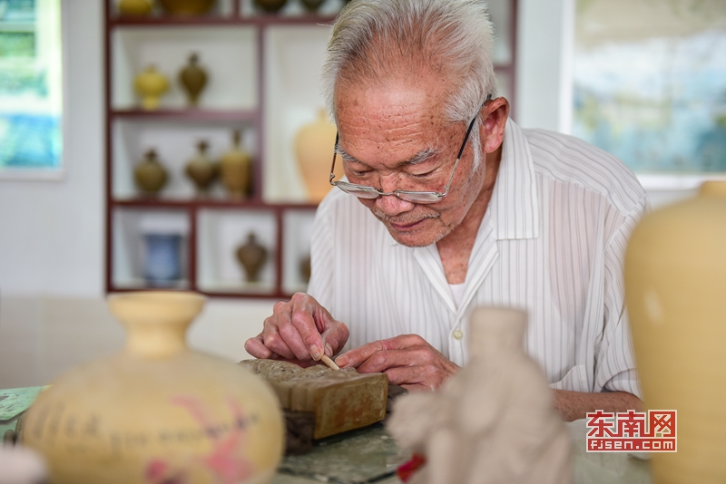 在磁灶陶瓷燒制技藝傳承基地,一名白發(fā)蒼蒼的老人還在堅持傳統(tǒng)技藝。東南網記者 林婕 攝