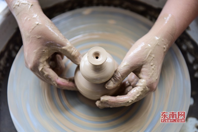 拉坯是將制備好的泥料放在坯車上,用輪制成型方法制成具有一定形狀和尺寸的坯件。東南網記者 林婕 攝