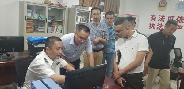 省海洋與漁業局副局長翁新平在石獅祥芝中心漁港指揮控制中心查看漁船進港避風情況。 省海洋漁業局供圖