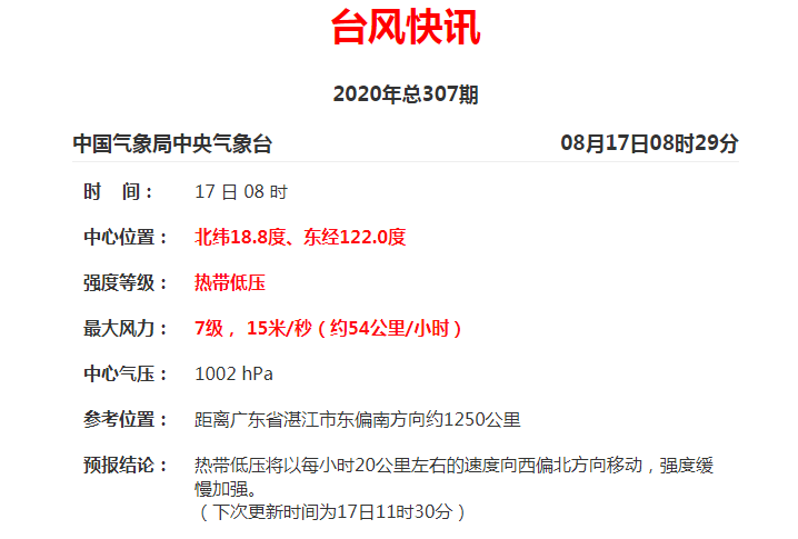 今天上午8時(shí),其中心距離廣東省湛江市東偏南方向約1250公里,中心附近最大風(fēng)力有7級(jí)(15米/秒)。