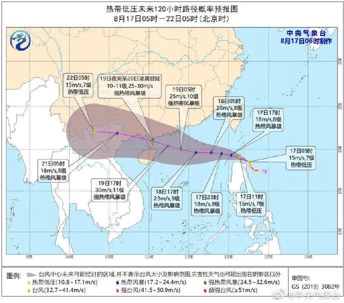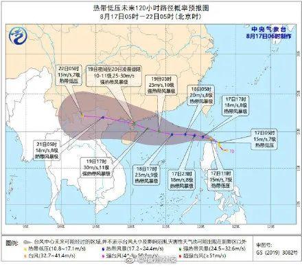 會(huì)商指出,熱帶低壓于8月16日17時(shí)在菲律賓東部近海生成,中心位于北緯17.5度、東經(jīng)123.7度,中心附近最大風(fēng)速15米/秒(7級(jí))。