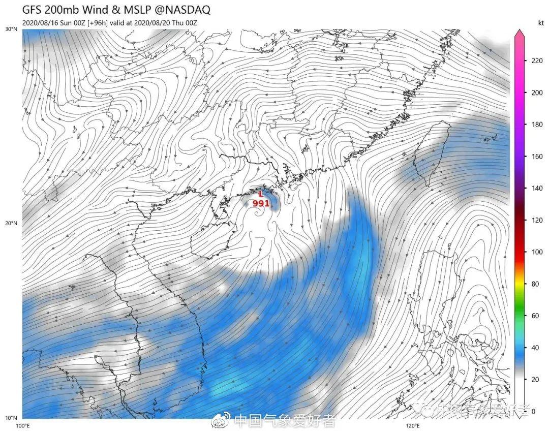 99W在廣東近海的高空流場(chǎng)可見(jiàn),北向流出通道未打開。中氣愛(ài)根據(jù)GFS數(shù)據(jù)制作